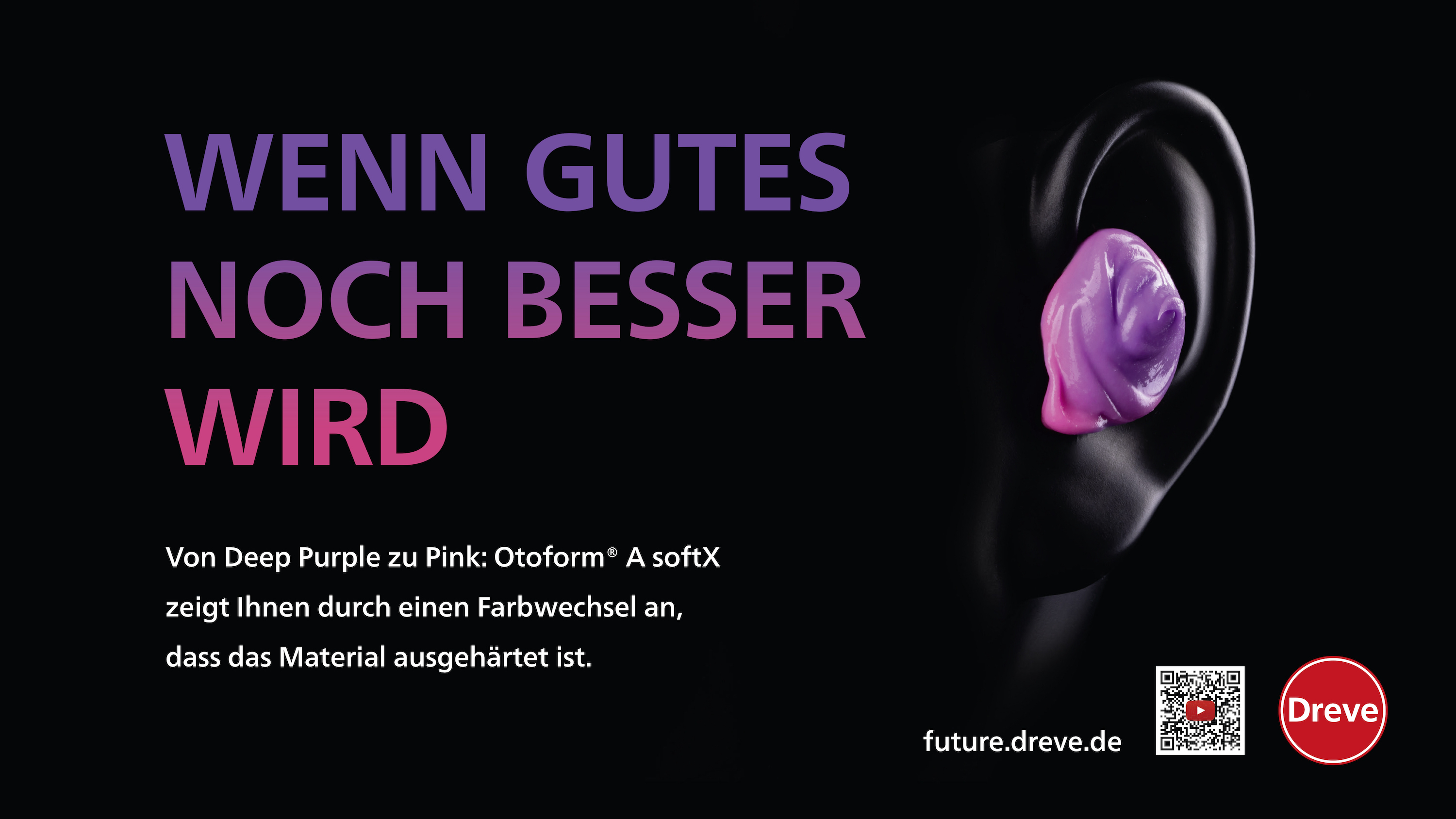 Es handelt sich um eine chemische Reaktion des Farbpigments: Additionsvernetzende Silikone härten in einer Hydrosilylierungsreaktion unter Platinkatalyse aus. Durch die Verwendung eines Farbpigments, das durch chemische Reaktion gleichzeitig seine chromophore Struktur und damit seine Farbe ändert, ist es möglich, die Aushärtung von Otoform® A softX im Ohr durch einen Farbumschlag von violett zu pink anzuzeigen. Diese Colour-Cure Technology macht die Ohrabformung für Sie noch einfacher und sicherer.